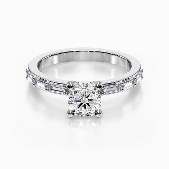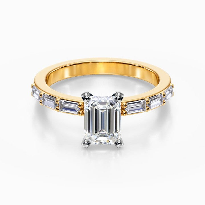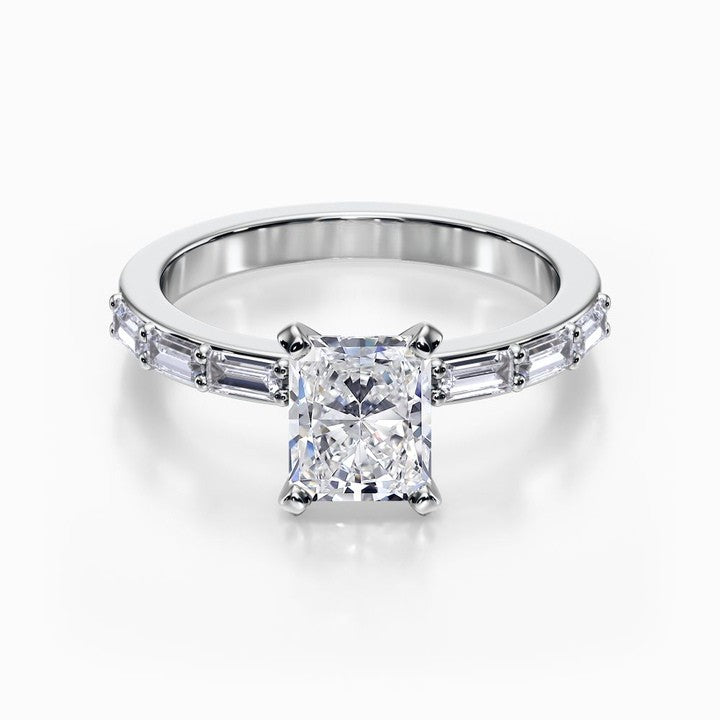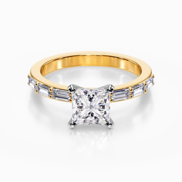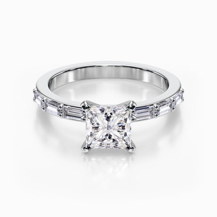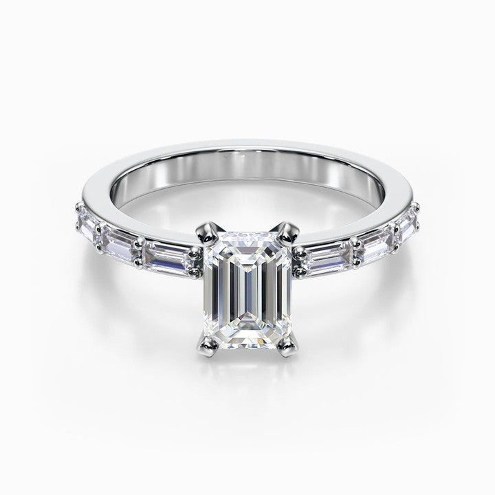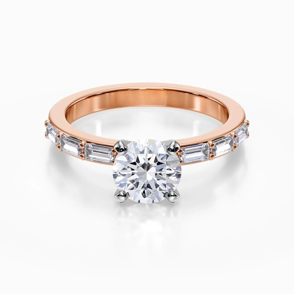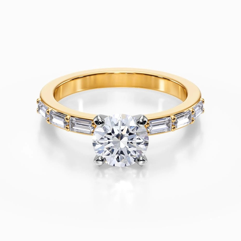 Meet the Baguette Pavé Engagement Ring, sleek and architectural. Each shoulder features a neat rhythm of straight baguette bars separated by petite round pavé links for a bright, continuous line of sparkle. A refined four-prong basket with an open gallery invites light from every angle, while the straight, gently tapered band keeps the profile comfortable for everyday wear. Choose lab-grown (D/VS1) in 1.0ct or 1.5ct, or natural (F/VS1) diamond for a timeless center. Available in 18K White Gold, 18K Yellow Gold, or 18K Rose Gold to suit your style. Center Diamond is graded by GIA or IGI and delivered with its official report for proof of quality, authenticity, and exact specs.