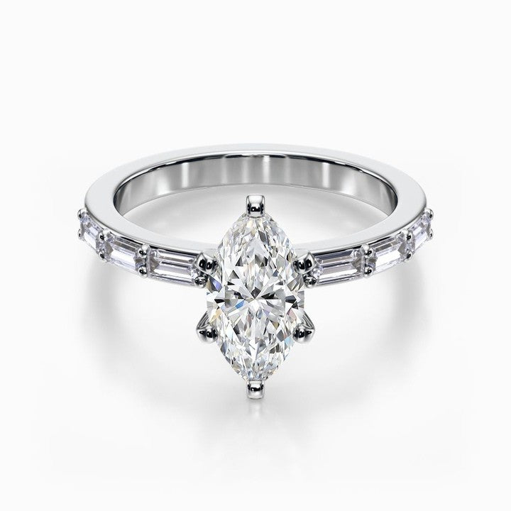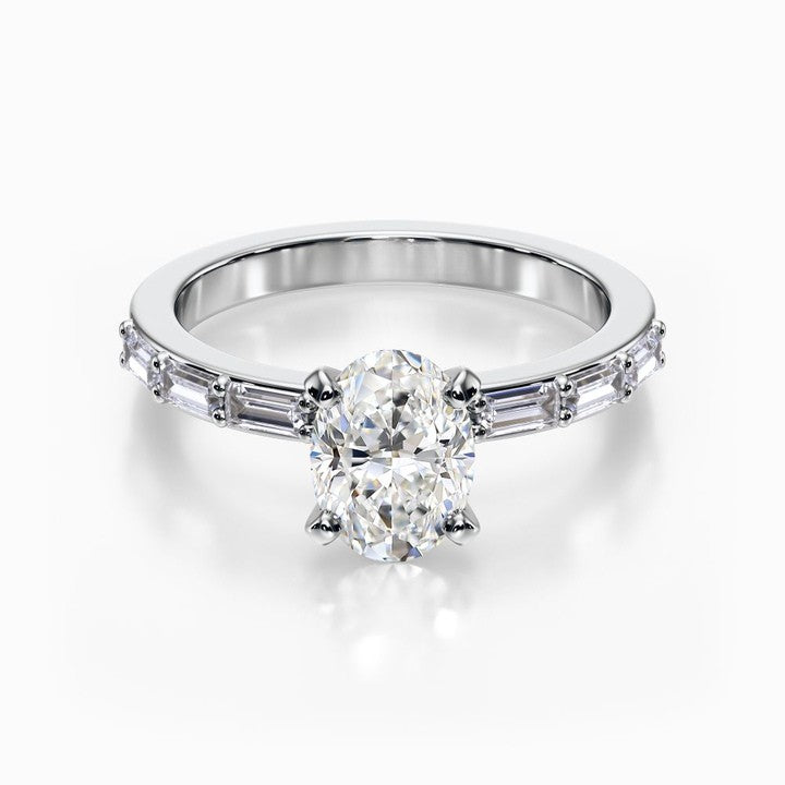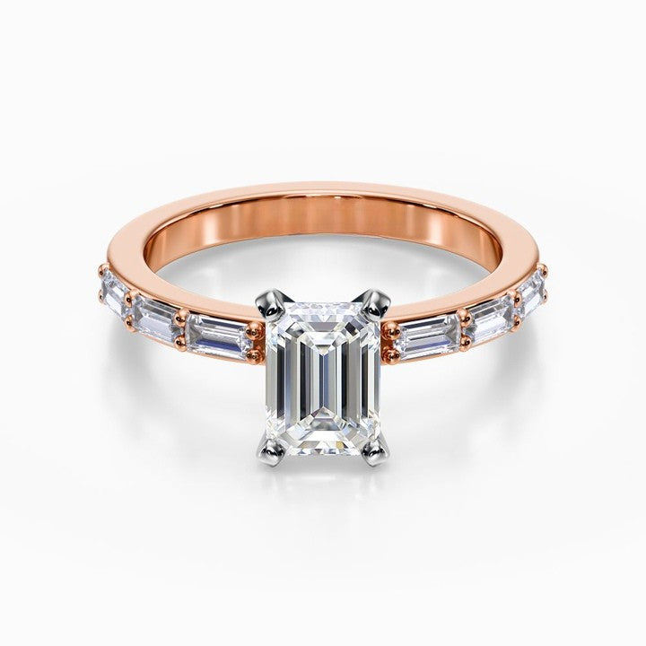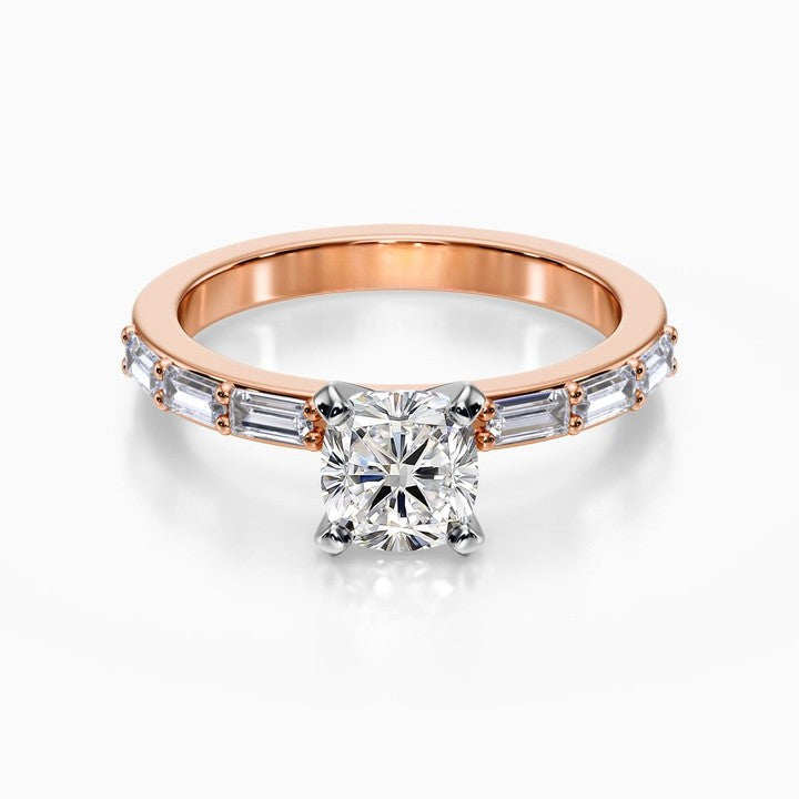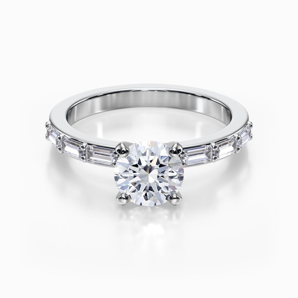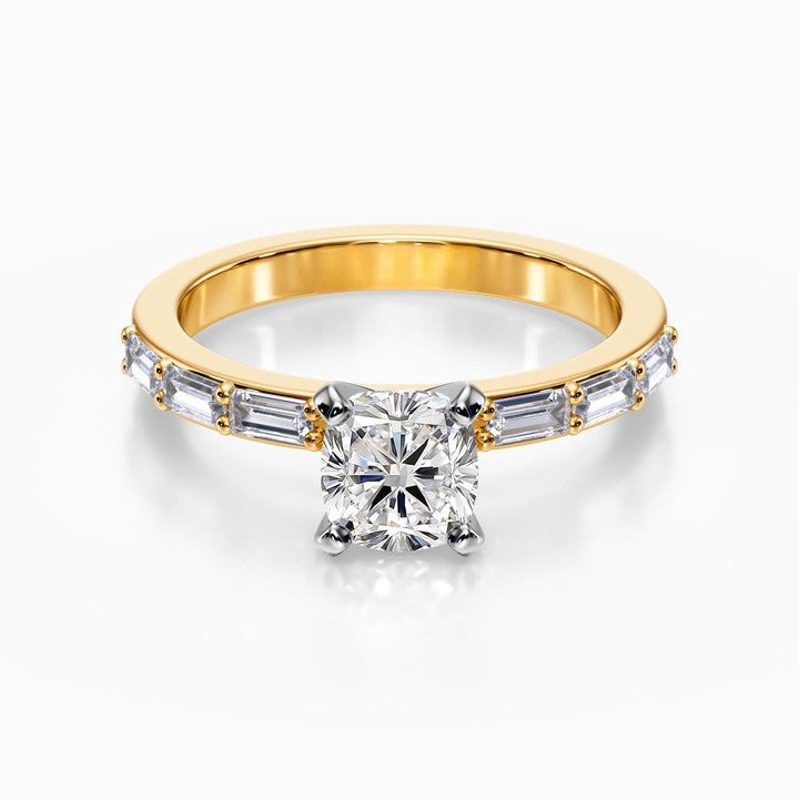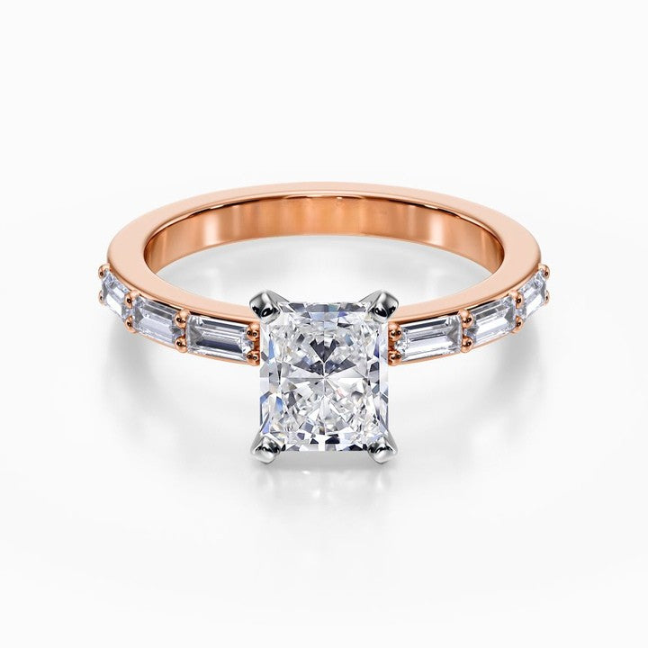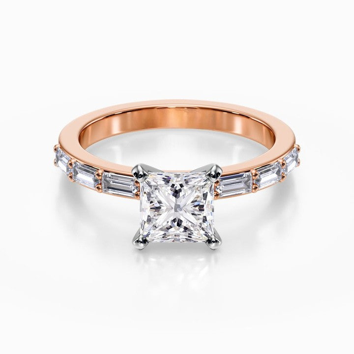 Meet the Baguette Pavé Engagement Ring, sleek and architectural. Each shoulder features a neat rhythm of straight baguette bars separated by petite round pavé links for a bright, continuous line of sparkle. A refined four-prong basket with an open gallery invites light from every angle, while the straight, gently tapered band keeps the profile comfortable for everyday wear. Choose lab-grown (D/VS1) in 1.0ct or 1.5ct, or natural (F/VS1) diamond for a timeless center. Available in 18K White Gold, 18K Yellow Gold, or 18K Rose Gold to suit your style. Center Diamond is graded by GIA or IGI and delivered with its official report for proof of quality, authenticity, and exact specs.