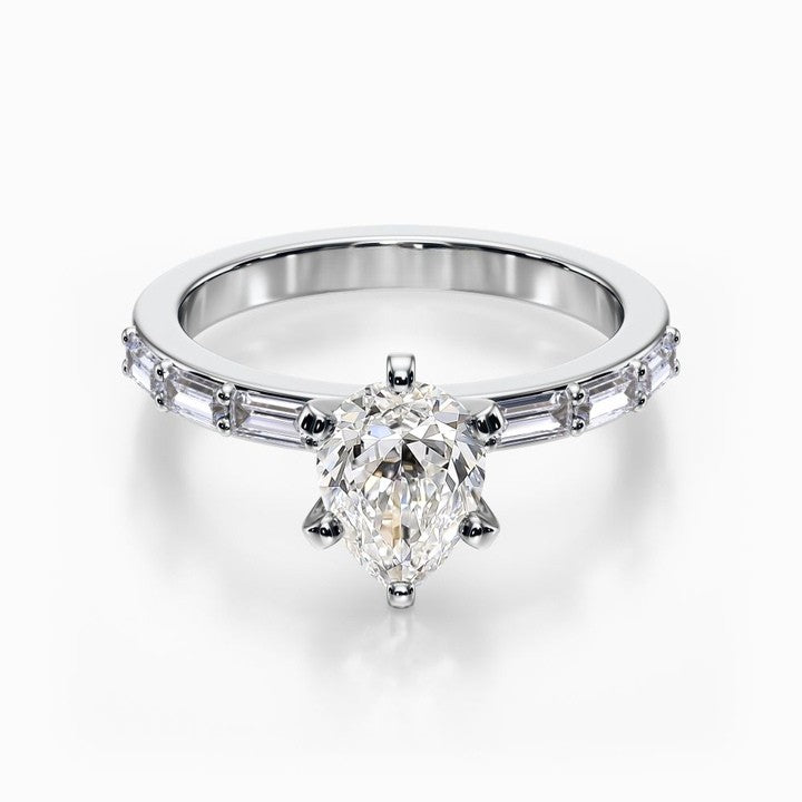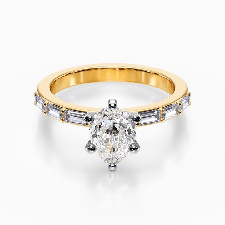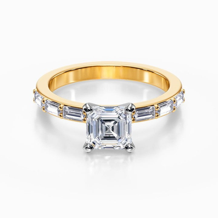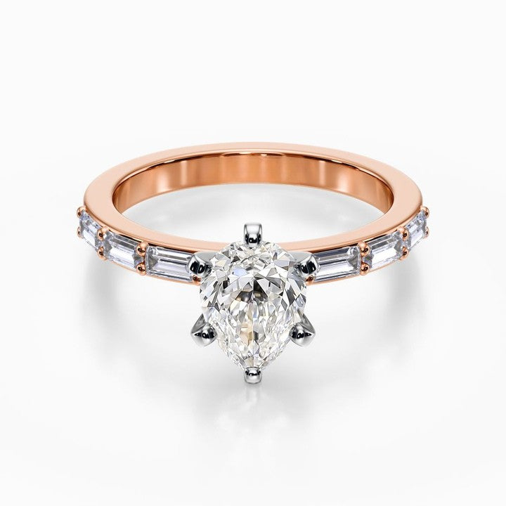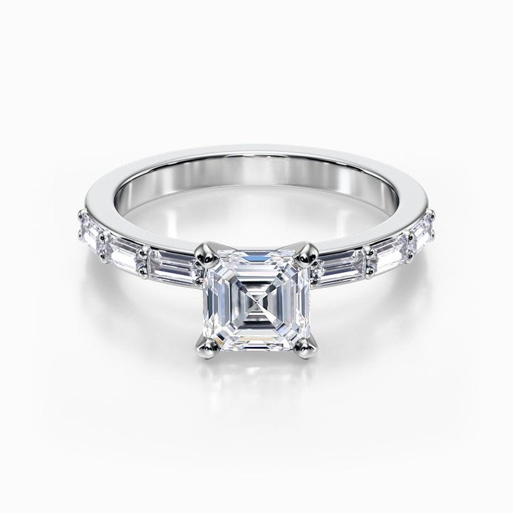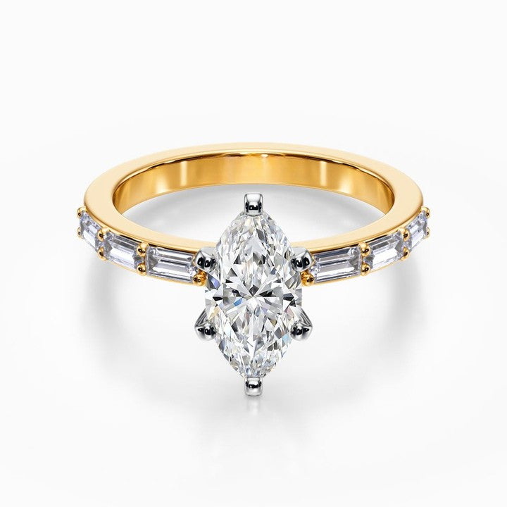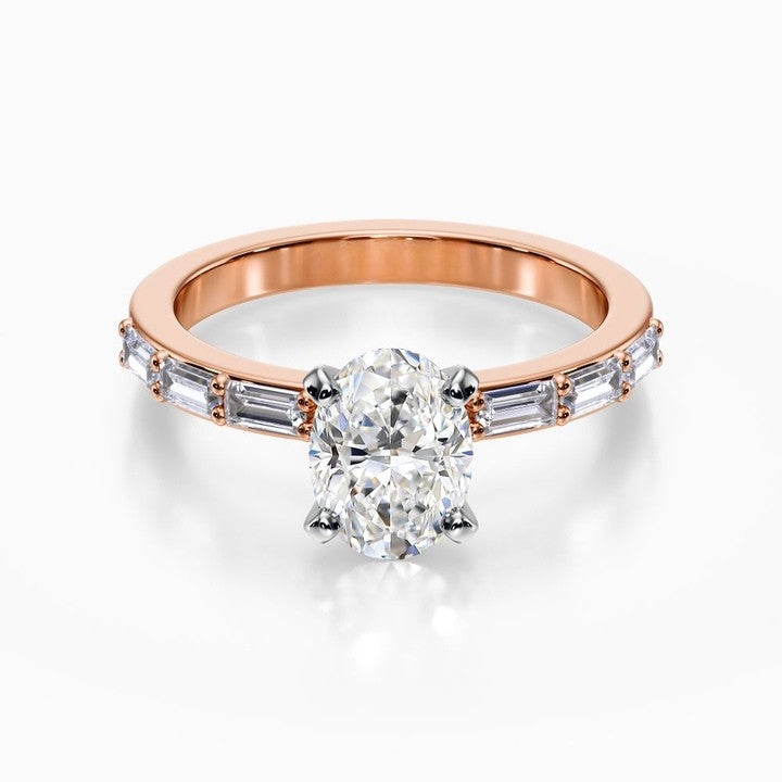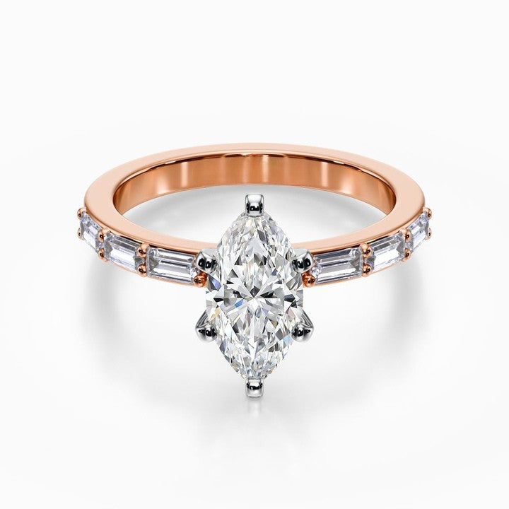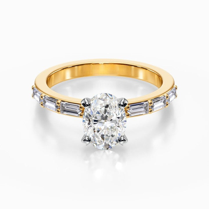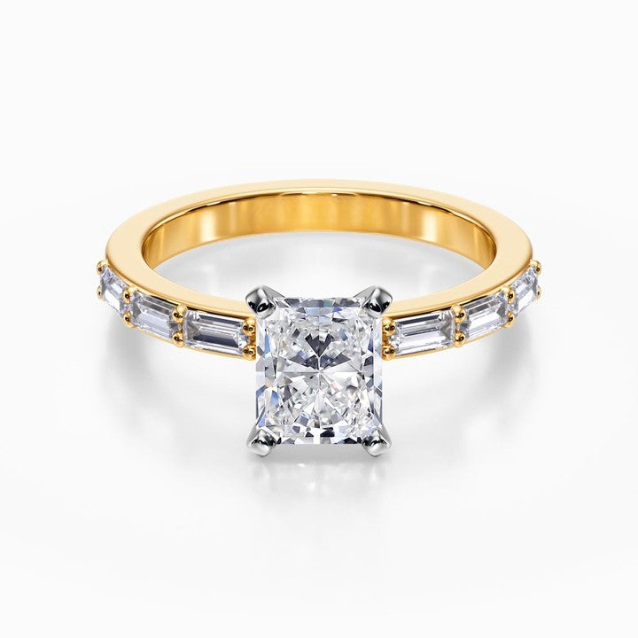 Meet the Baguette Pavé Engagement Ring, sleek and architectural. Each shoulder features a neat rhythm of straight baguette bars separated by petite round pavé links for a bright, continuous line of sparkle. A refined four-prong basket with an open gallery invites light from every angle, while the straight, gently tapered band keeps the profile comfortable for everyday wear. Choose lab-grown (D/VS1) in 1.0ct or 1.5ct, or natural (F/VS1) diamond for a timeless center. Available in 18K White Gold, 18K Yellow Gold, or 18K Rose Gold to suit your style. Center Diamond is graded by GIA or IGI and delivered with its official report for proof of quality, authenticity, and exact specs.
