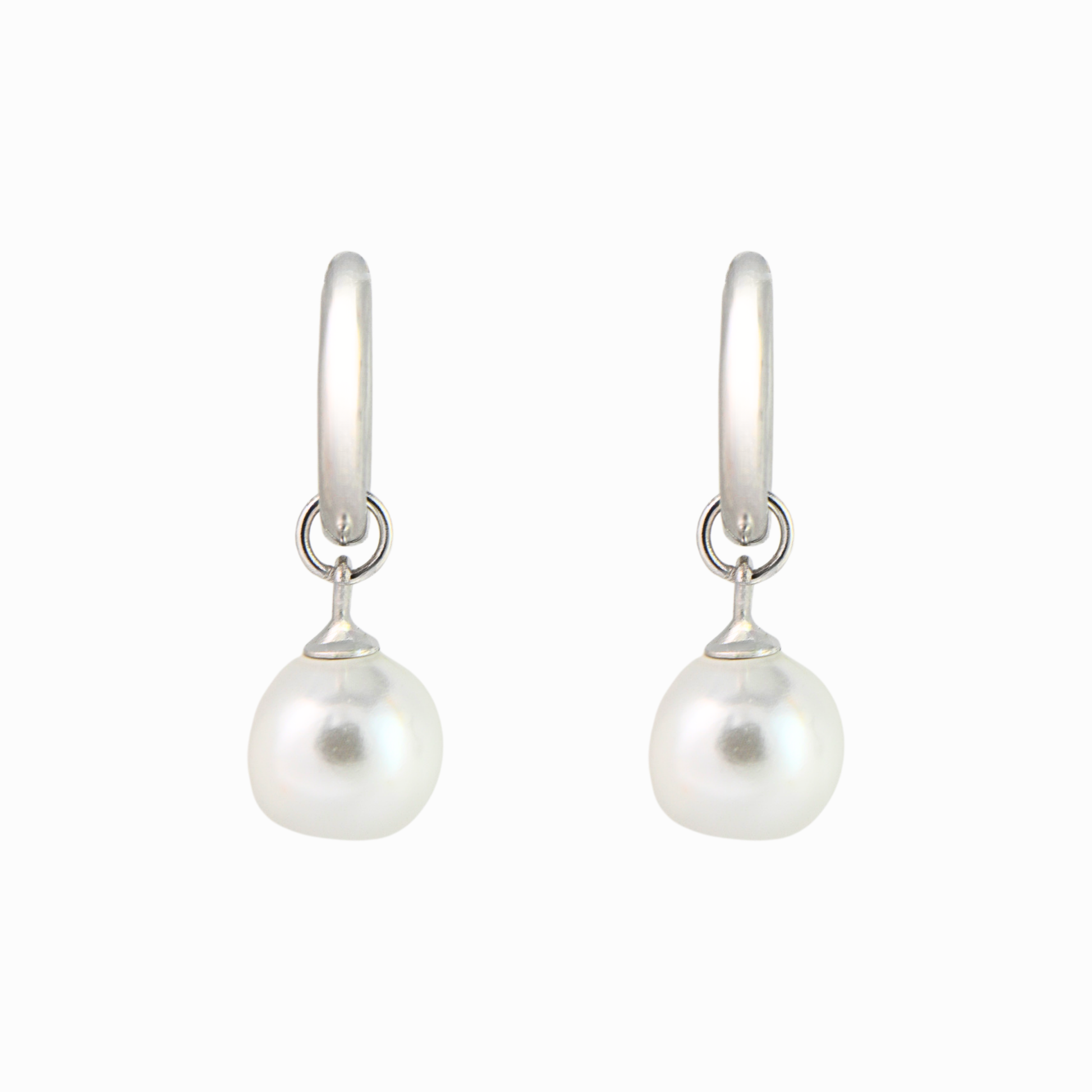 A modern take on a classic, these hoop earrings showcase a single lustrous pearl dangling from a sleek silver hoop. The rhodium plating lends a brilliant, tarnish‑resistant finish, while the pearl’s soft sheen adds an air of refined elegance. Lightweight and versatile, they transition effortlessly from daytime chic to evening glamour.