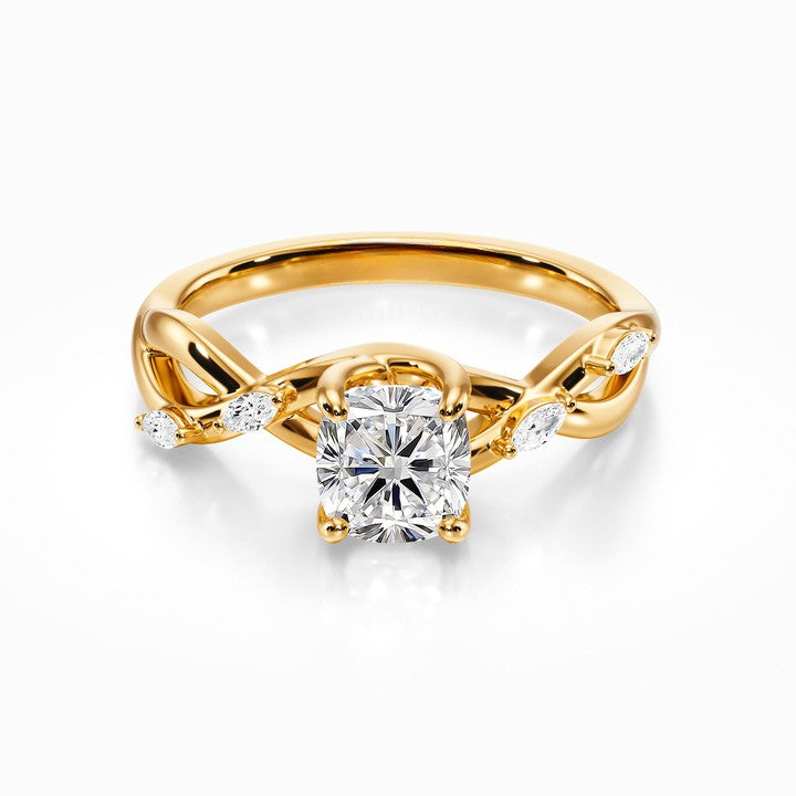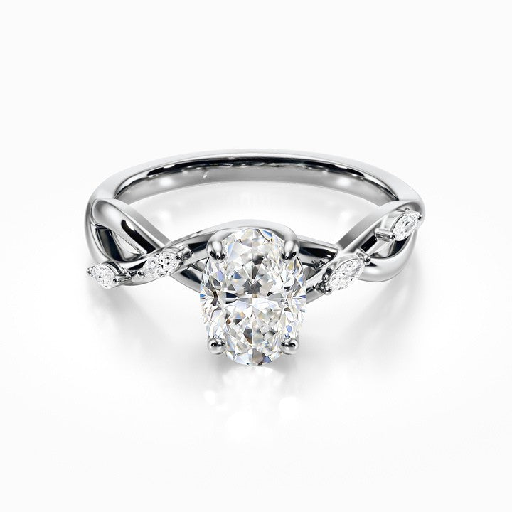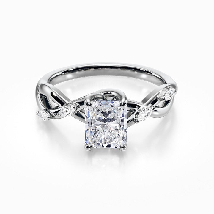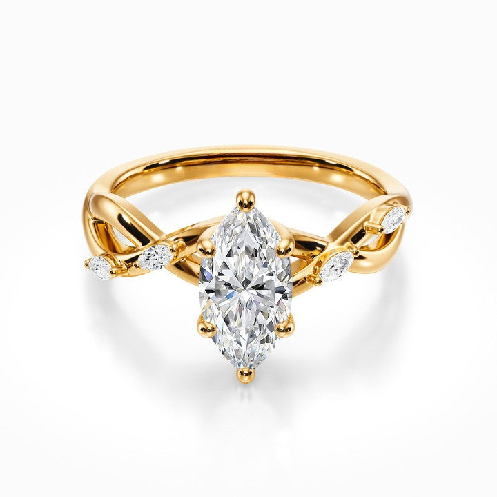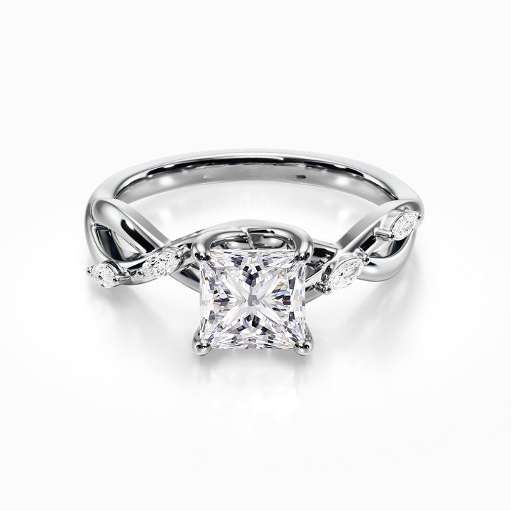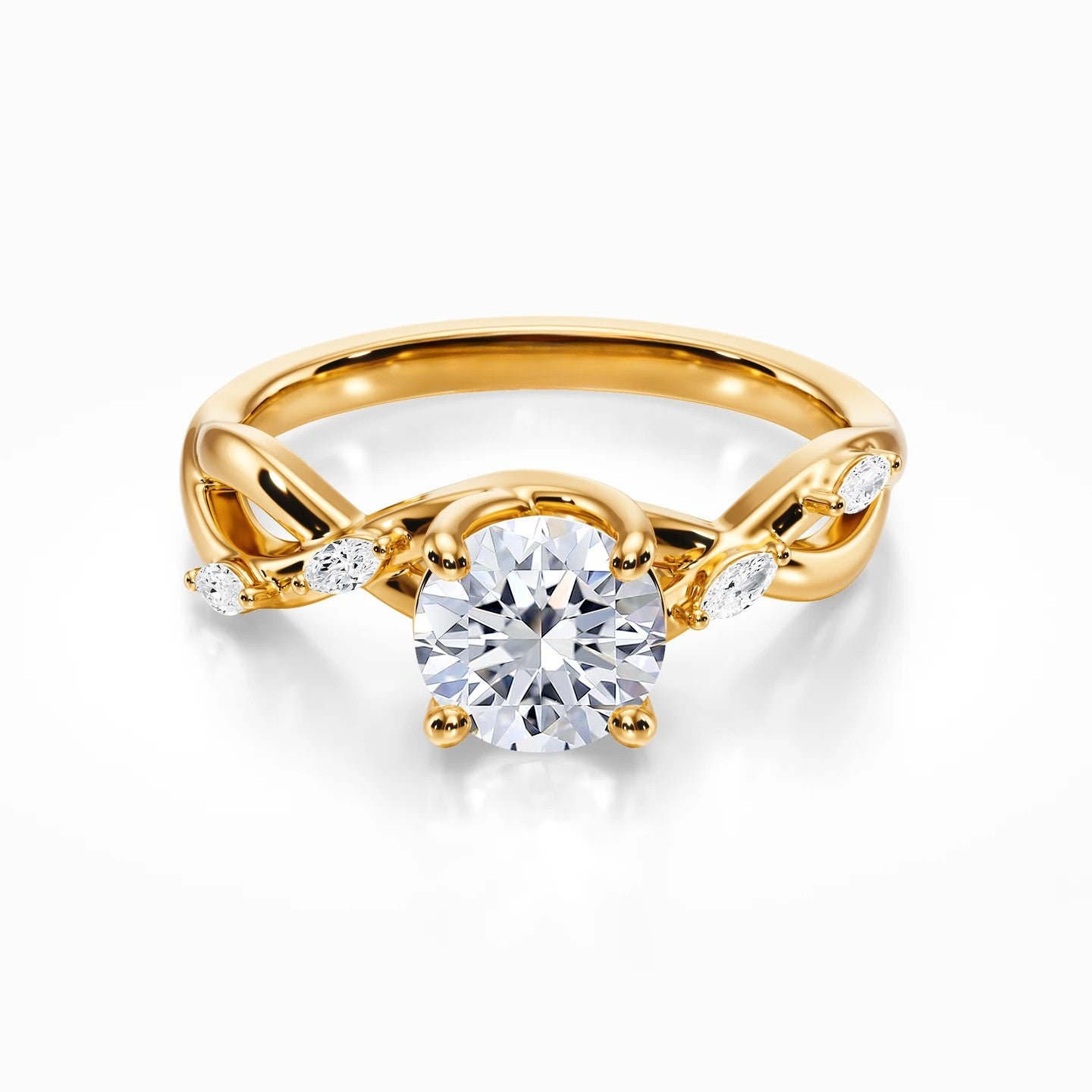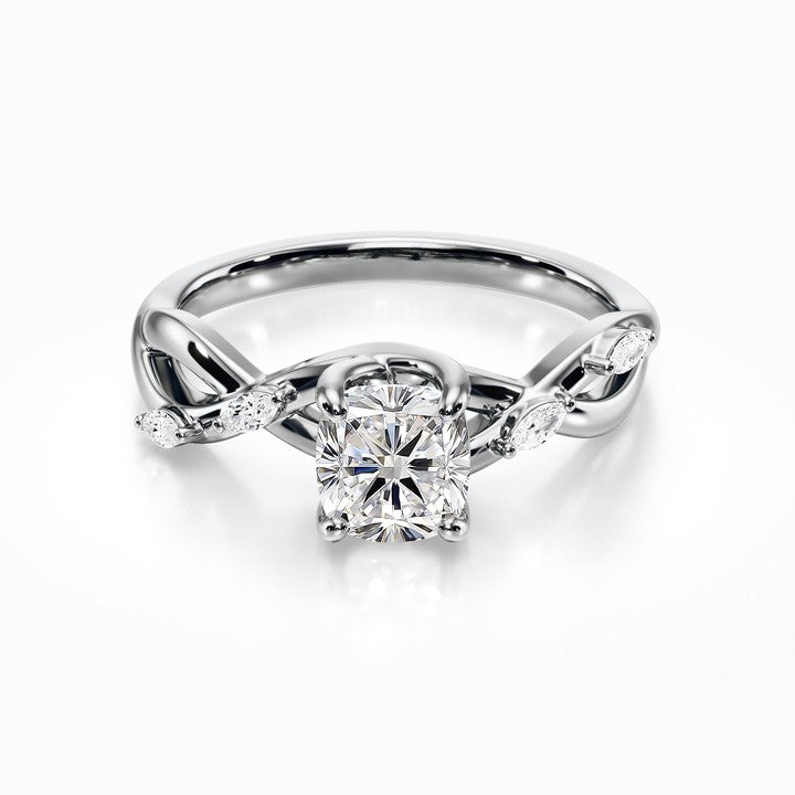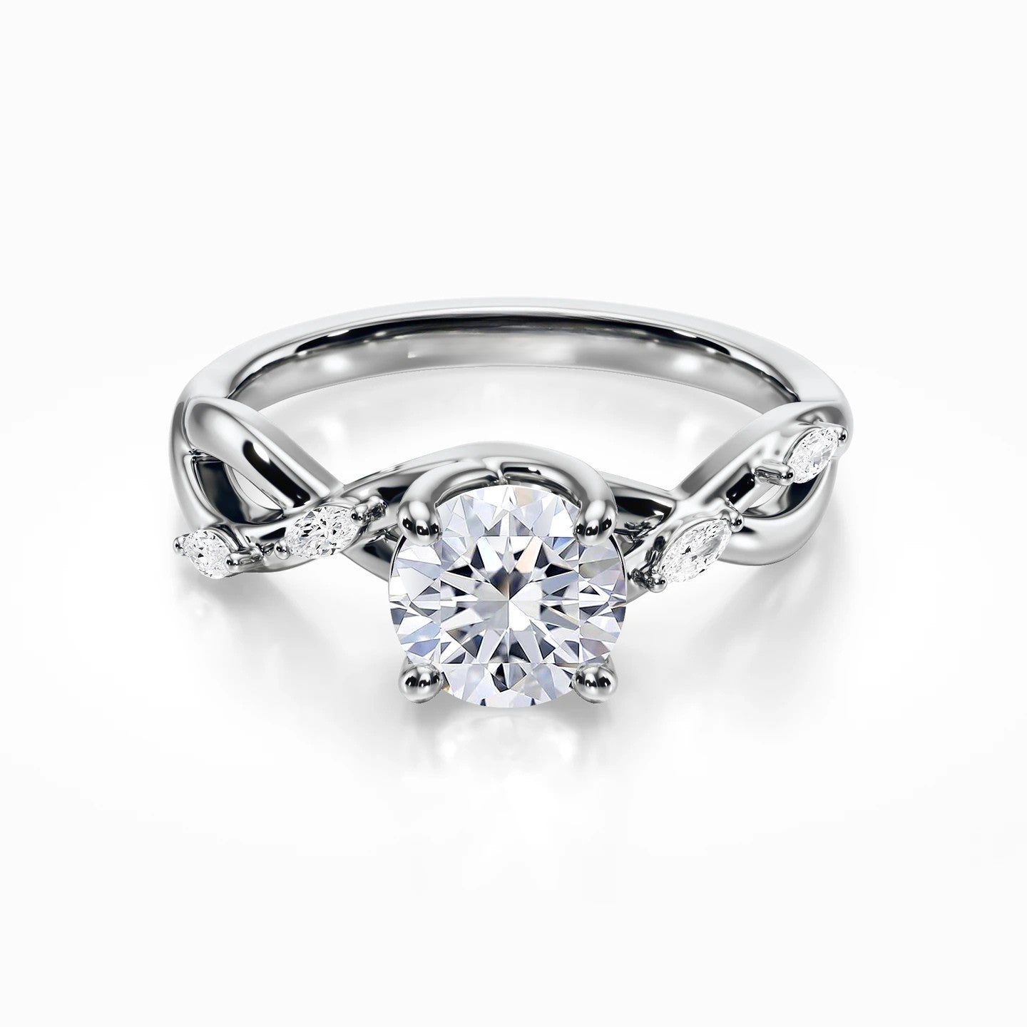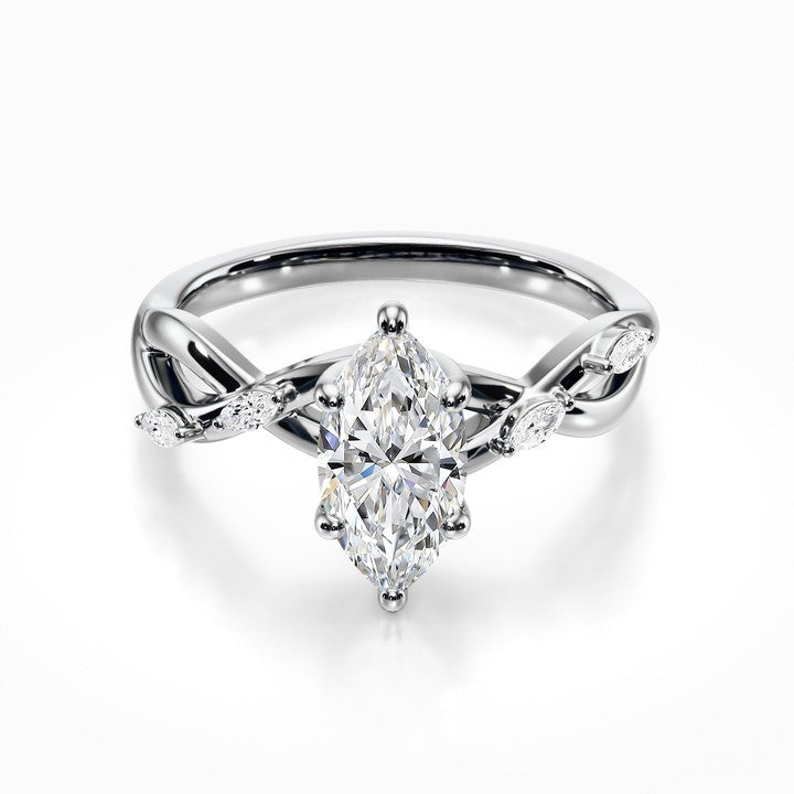 Meet the Floral Twist Engagement Ring, a nature-inspired silhouette where a slender, interlaced vine wraps toward the center. Petite marquise and round accent diamonds dot each shoulder like leaves and buds, leading to a refined four-prong head. A crossover cathedral under-gallery welcomes light from all angles, enhancing brilliance while keeping the profile comfortable for everyday wear. Choose lab-grown (D/VS1) in 1.0ct or 1.5ct, or natural (F/VS1) diamond for a timeless center. Available in 18K White Gold, 18K Yellow Gold, or 18K Rose Gold to suit your style. Center Diamond is graded by GIA or IGI and delivered with its official report for proof of quality, authenticity, and exact specs.