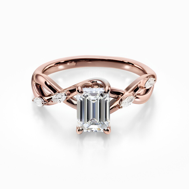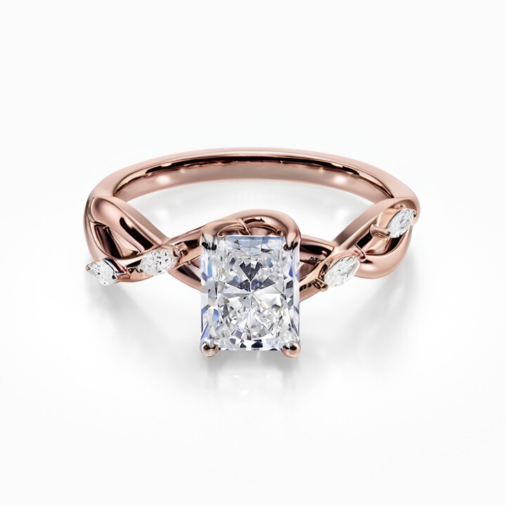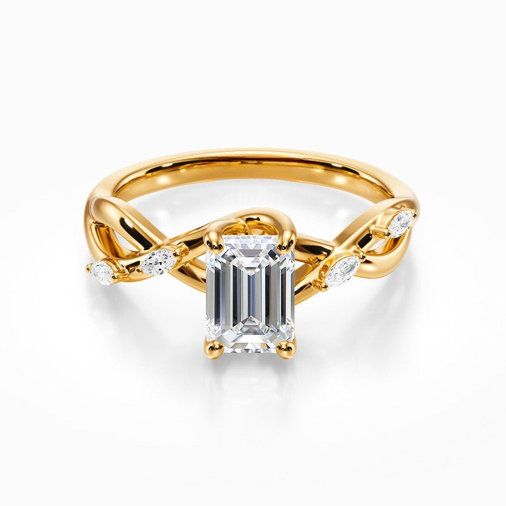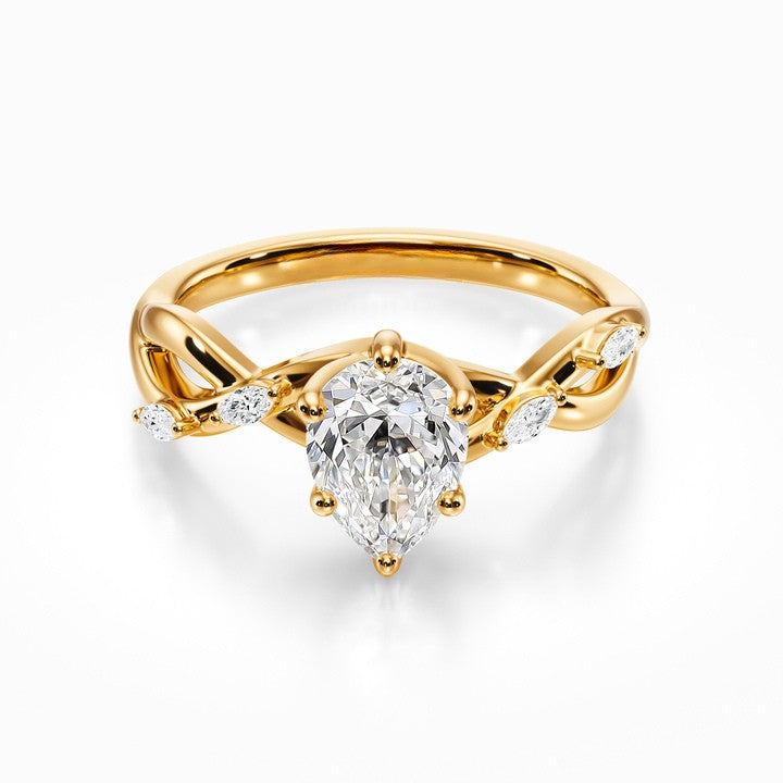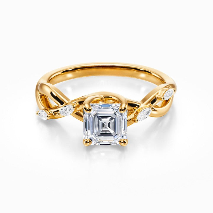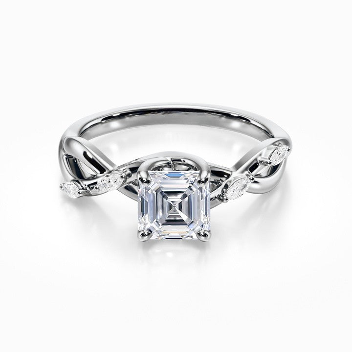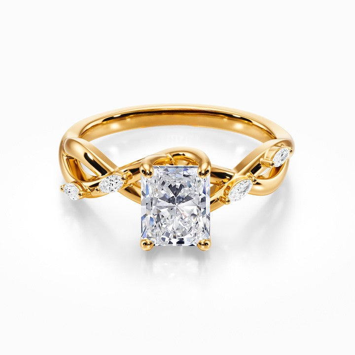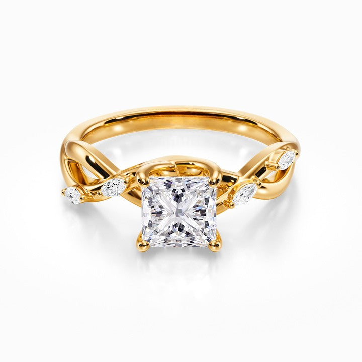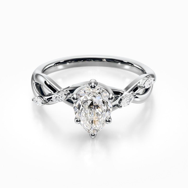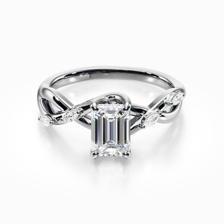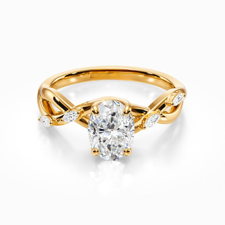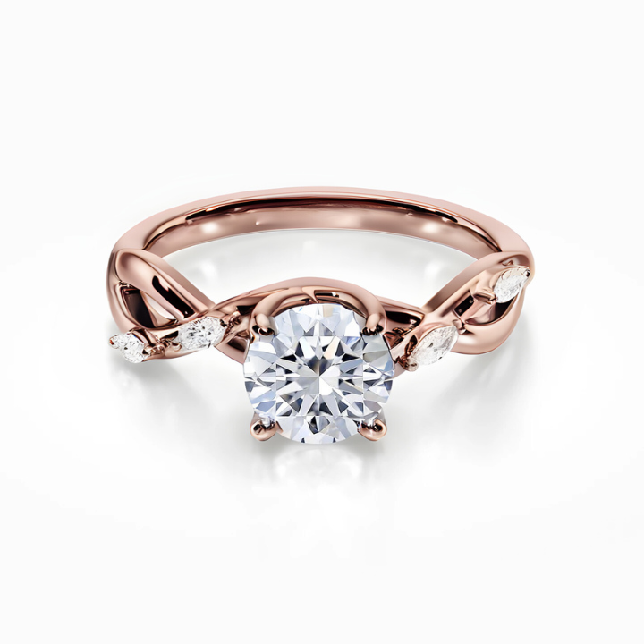 Meet the Floral Twist Engagement Ring, a nature-inspired silhouette where a slender, interlaced vine wraps toward the center. Petite marquise and round accent diamonds dot each shoulder like leaves and buds, leading to a refined four-prong head. A crossover cathedral under-gallery welcomes light from all angles, enhancing brilliance while keeping the profile comfortable for everyday wear. Choose lab-grown (D/VS1) in 1.0ct or 1.5ct, or natural (F/VS1) diamond for a timeless center. Available in 18K White Gold, 18K Yellow Gold, or 18K Rose Gold to suit your style. Center Diamond is graded by GIA or IGI and delivered with its official report for proof of quality, authenticity, and exact specs.