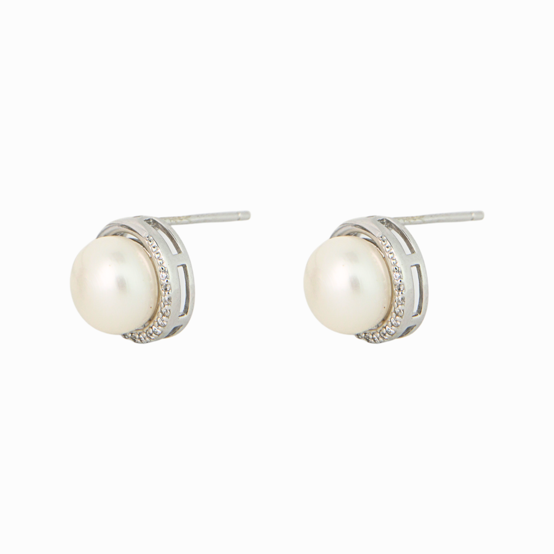 A timeless classic reimagined, these stud earrings showcase a lustrous cultured pearl cradled by a gleaming sterling‑silver half‑halo of sparkling pavé crystals. The rhodium‑plated finish ensures lasting shine and tarnish resistance, while the compact silhouette makes them perfect for everyday elegance or dressing up for special occasions. Subtle yet striking, the asymmetric halo adds a contemporary twist to the quintessential pearl stud.