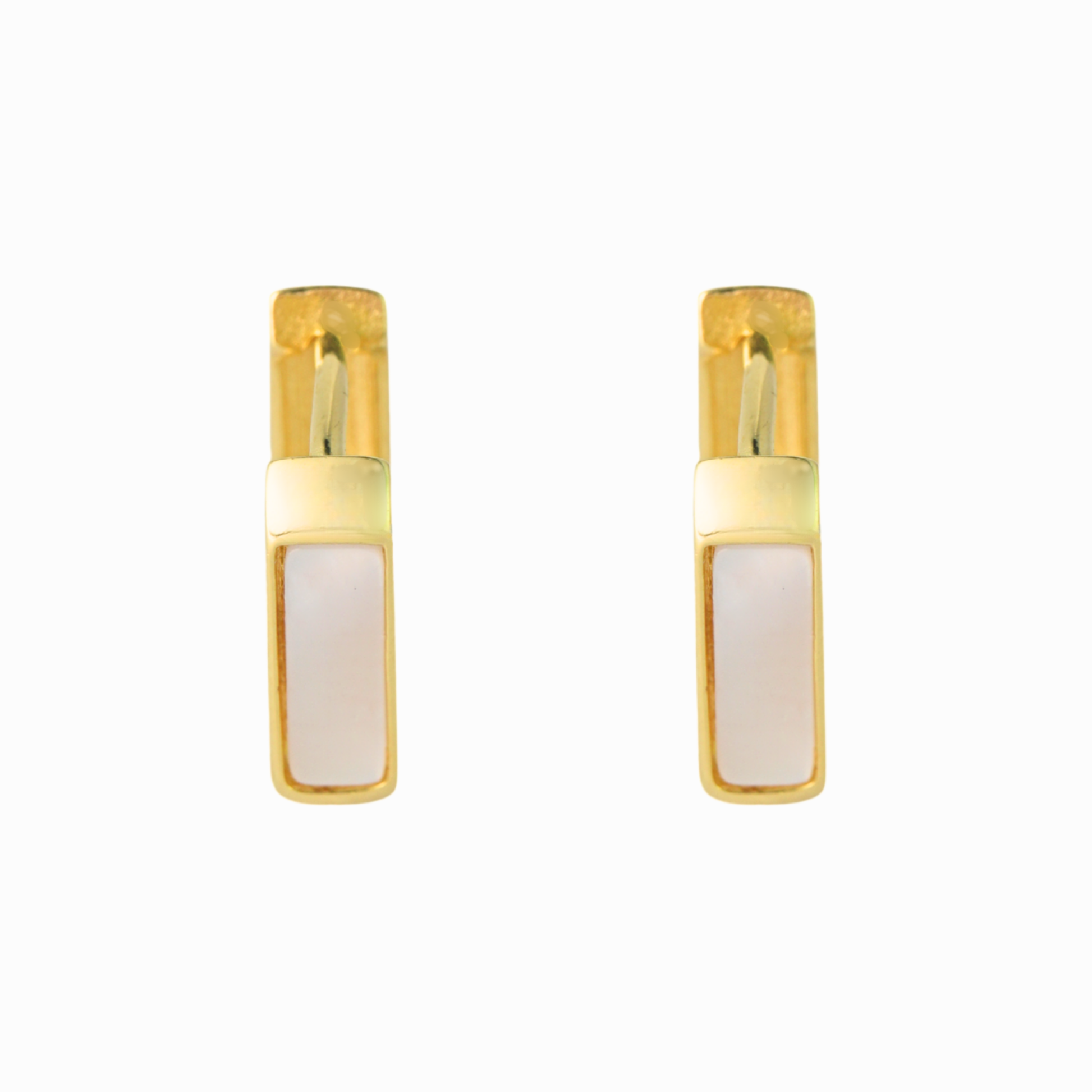 Chic and architectural, these petite huggie hoops frame a slim, rectangular Mother‑of‑Pearl panel in a gleaming gold‑plated channel. The crisp right-angled profile contrasts the pearl’s soft iridescence, creating a balanced play of form and light. Securely hinged for easy on‑and‑off wear, they rest close to the ear for an effortlessly polished look, ideal for elevating both casual and tailored ensembles.