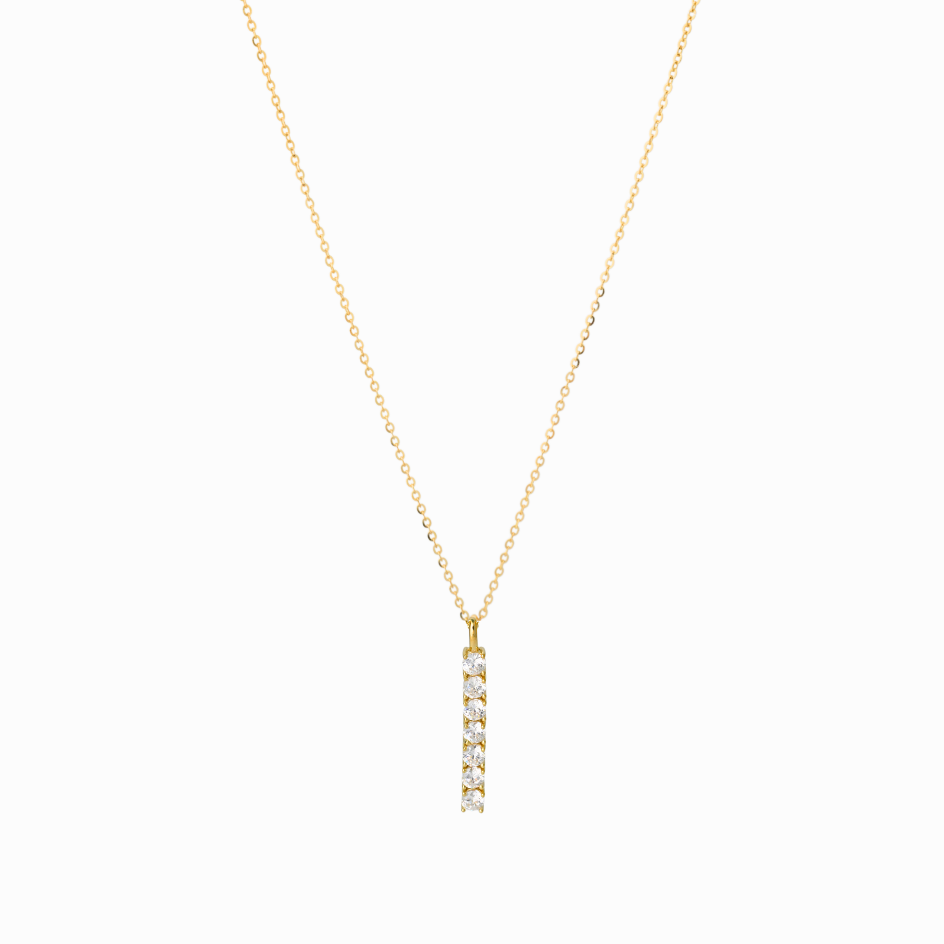 A row of CZ stones in a sleek vertical bar, catching the light with every movement. The minimalist pendant floats on an adjustable chain, offering a modern take on classic sparkle. Perfect for layering or worn alone, this necklace adds a refined linear accent to any ensemble.