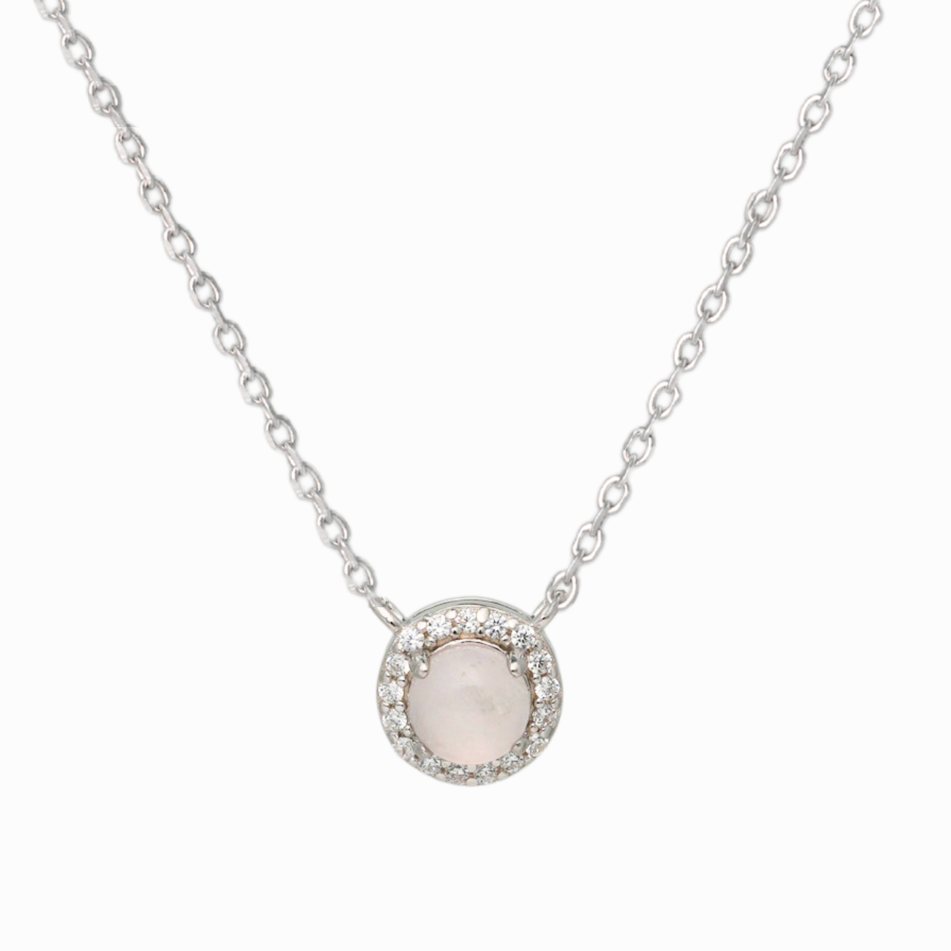 Infuse any look with ethereal glow in our Luminous Halo Rose Quartz Pendant Necklace. A Natural Rose Quartz floats at the heart of a sparkling CZ halo, all set in tarnish‑resistant rhodium‑plated sterling silver. Suspended from a 17 inch adjustable chain, its fine cable links lie comfortably against the skin and let you customize your perfect drop.