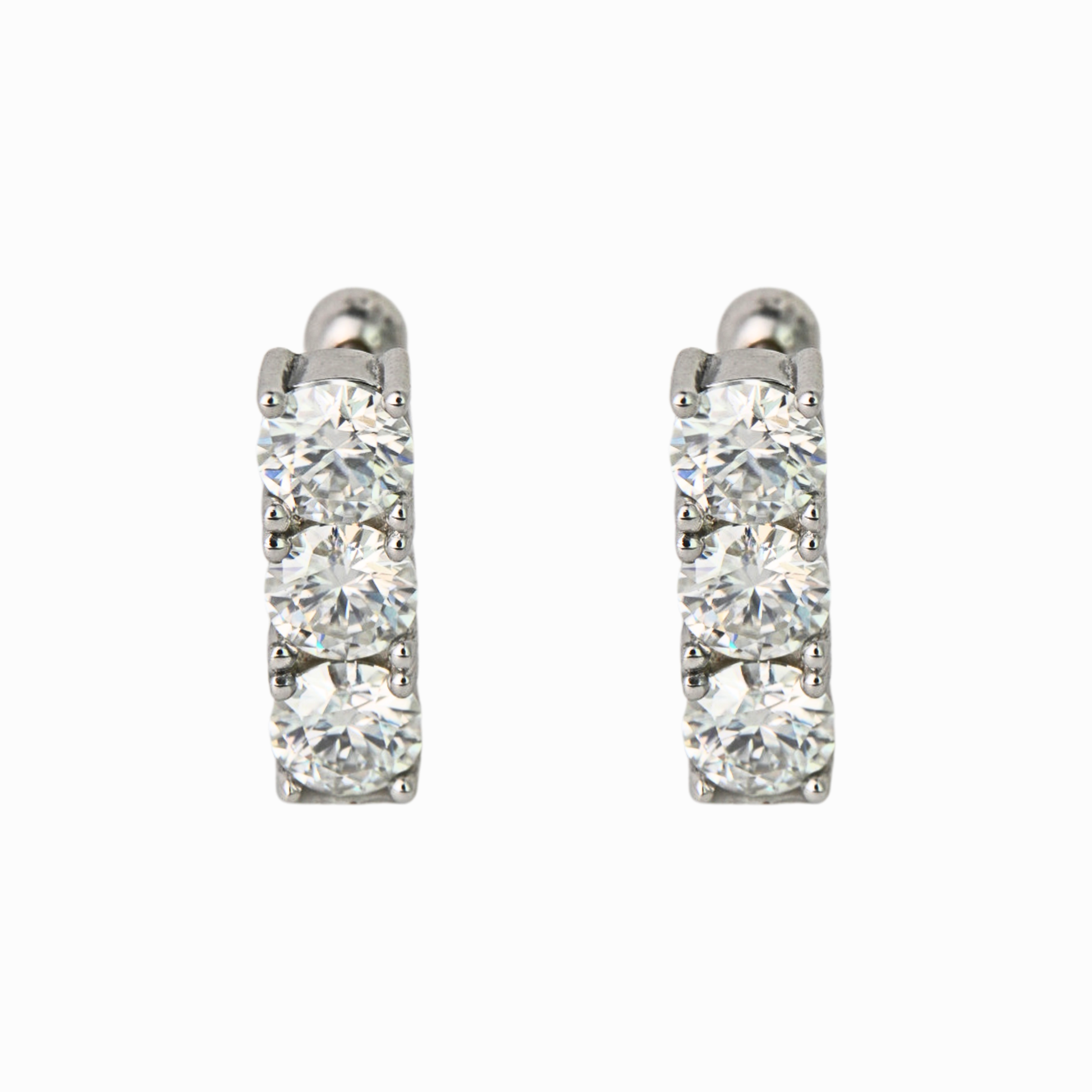 Elevate your look with these three stone moissanite bar stud earrings designed in a sleek Trinity bar setting. Each stud features three 0.2 carat round brilliant cut moissanites for 0.6 carat total per earring, delivering modern sparkle and refined elegance. Plated in warm Rhodium‑plated over sterling silver, these studs combine durability with a luxurious finish that wears beautifully from day to night.